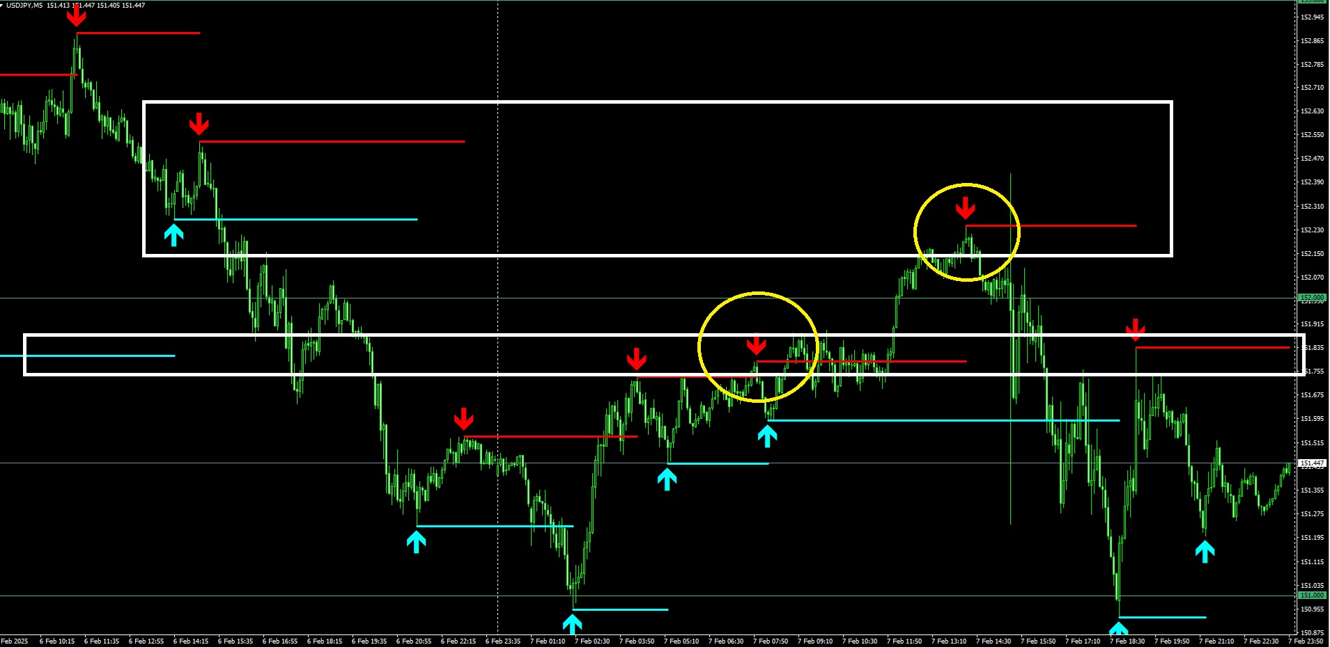 昨日(2025年2月7日)のドル円5分足チャートです。今週は4時間足などの上位足で見ても邪魔するものがなく一方的な下落トレンドが続くことが予想されていましたので、サルになってショートすれば勝てるボーナスデイだったかと思います。