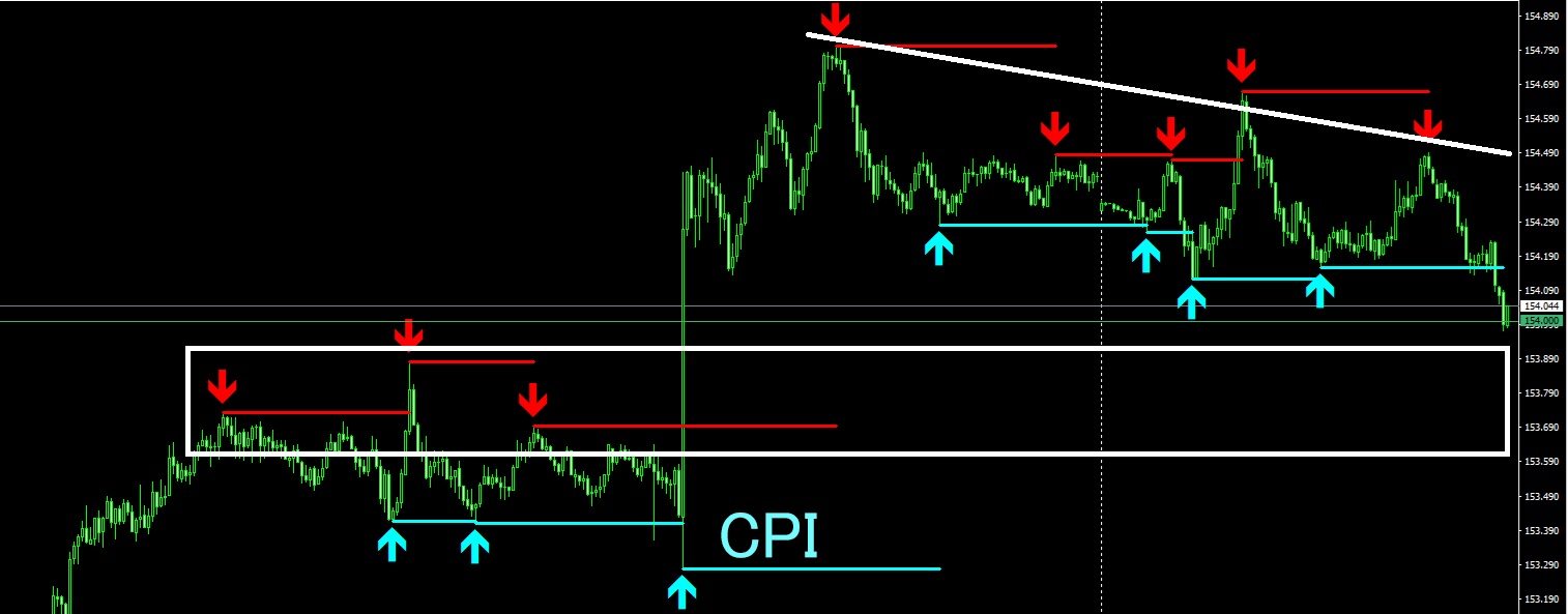 高値安値を切り下げながら昨日のレンジ上限に突入し、遅蒔きながら昨日のCPIに対する調整が始まっています。