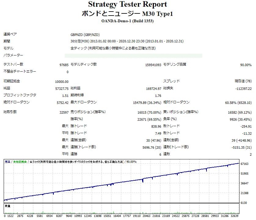 2013年1月~2019年12月までのGBP/NZDのバックテストはこの様になります。