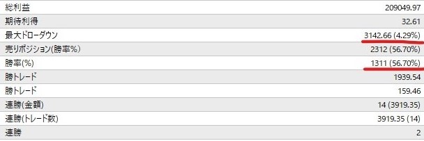 本EAでは、約19年間にもわたる長期間のバックテストであるにも関わらず、「4、29%」という驚異的に低い数値で制御できており、リスクの低さとパフォーマンスの安定性・安全性を裏付けています。