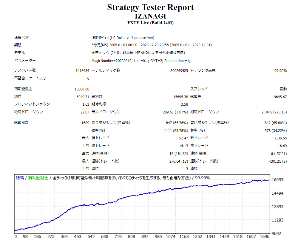 TDS(Tick Data Suite)を用い、スプレッドを「変動」に設定したバックテスト結果です。