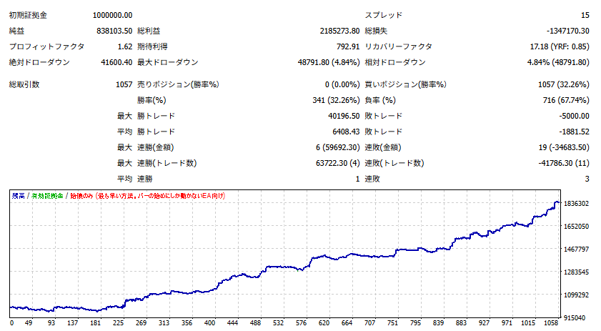 本EAはLongエントリーのみですが、 バックテスト自体は2005年から直近までの期間で行っており、 2008年のリーマンショック以降から2011年の頃までに 110円台から70円台までに円高になりましたが、 それでもバックテスト上では右肩上がりになっています。