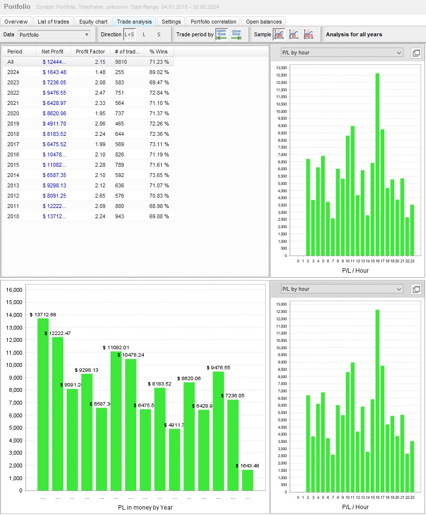 Quant Analyzerを使用し、ポートフォリオ運用全体のパフォーマンスを分析。複数通貨での分散効果により、安定した収益性が証明されました。