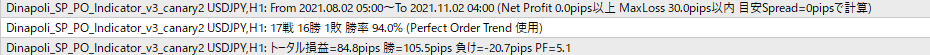 上図の設定では、ドル円1時間足の2021年8月2日から2021年11月2日の約3か月間のエントリーの集計ですが、売買回数は17回で16勝1敗、勝率94%、獲得pips84.8、プロフィットファクター5.1でした。