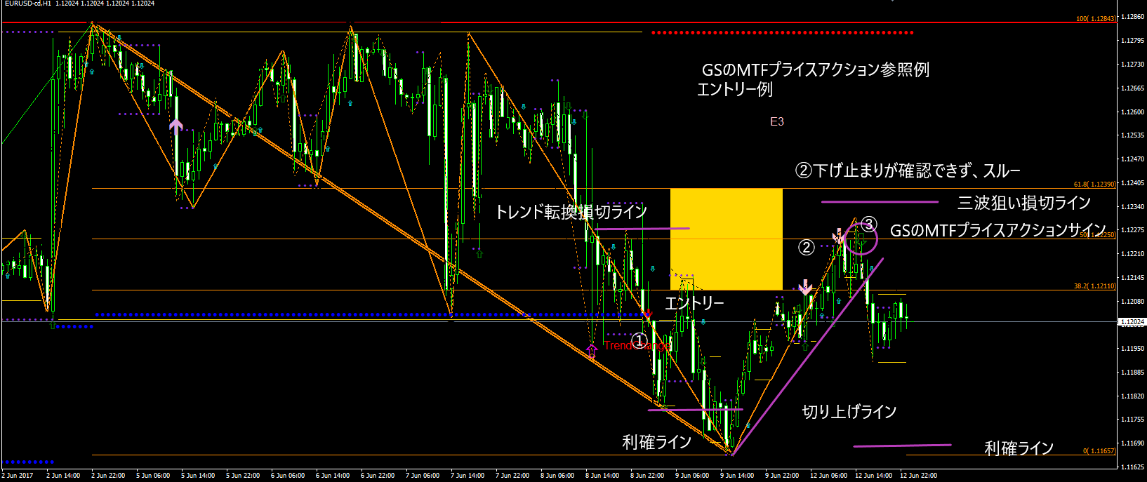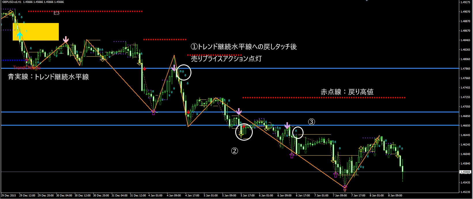 ・三波確定以降は、ジグザクによるトレンド継続水平線ブレイク後の水平線戻りタッチを追加