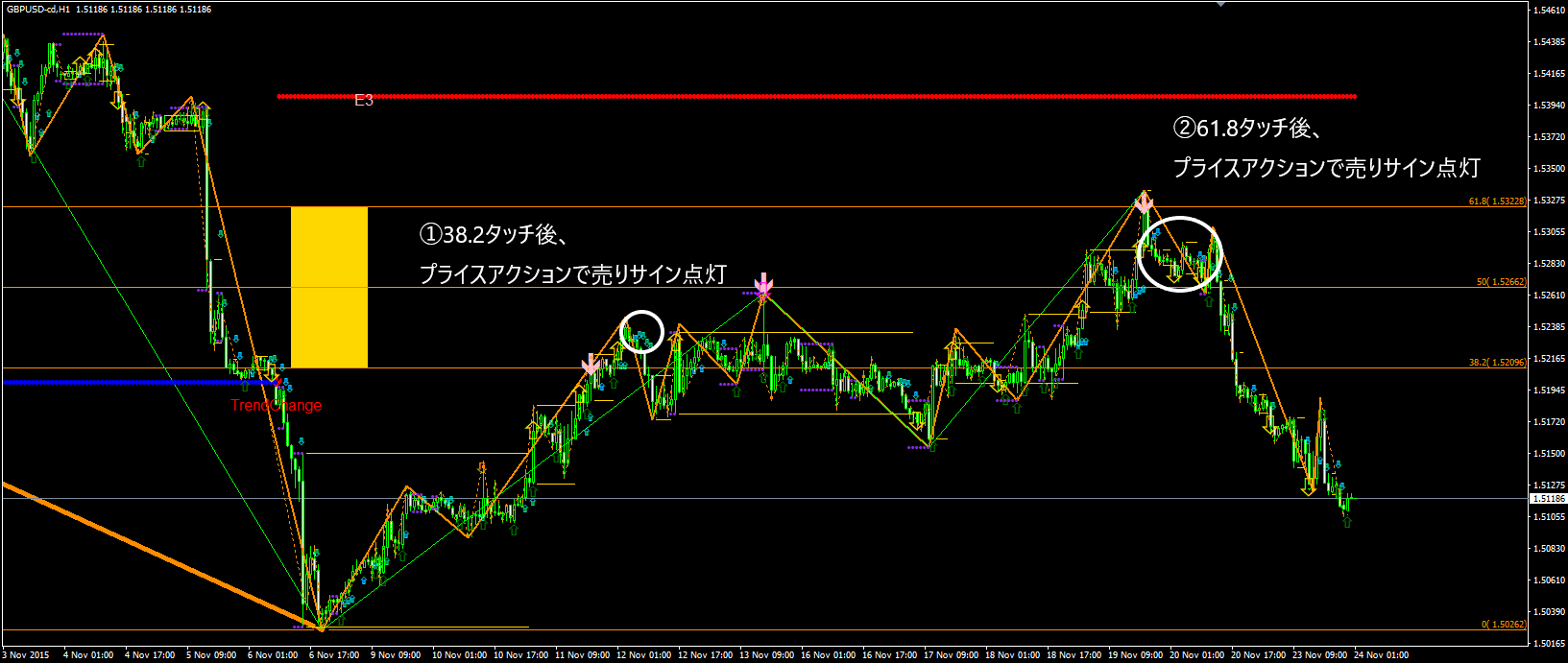 ・売買候補サインをフィボナッチ数値38.2、50、61.8タッチに変更