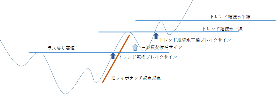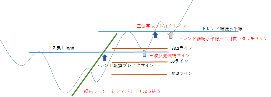 ・三波候補以降は、トレンド継続水平線戻りタッチサインを追加