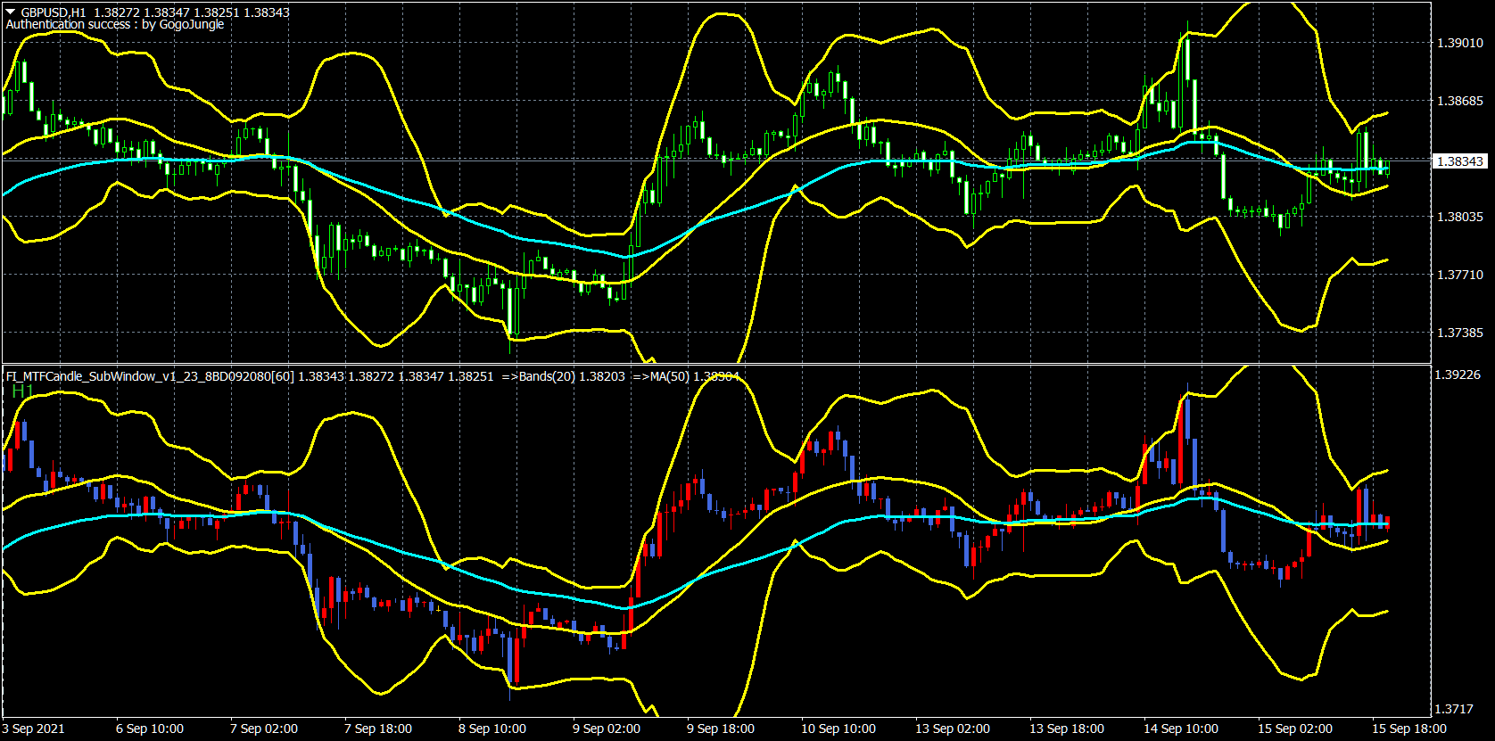 1時間足で、黄色がボリンジャーバンド、水色がMAです。