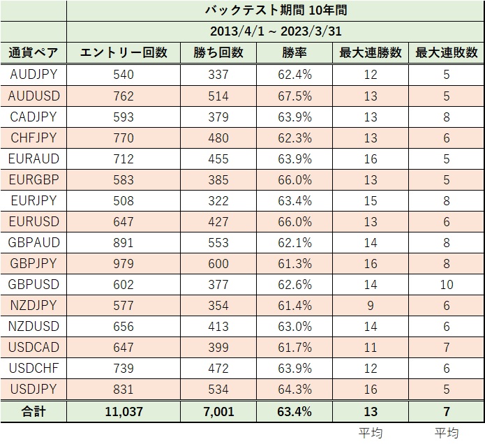 2013年4月1日 ~ 2023年3月31日の 10年分の主要16通貨ペアでのバックテスト結果グラフと通貨ペア毎の勝率表です。