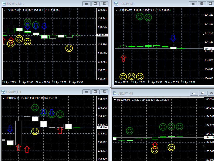 ・チャンスはニコちゃんマークと矢印が出た時になります。緑色は下、黄色は上となります。このサインツールはその時の強さが矢印表示となります。例:ニコちゃんマークと上矢印が連続で出ている場合は上昇相場と判断できます。