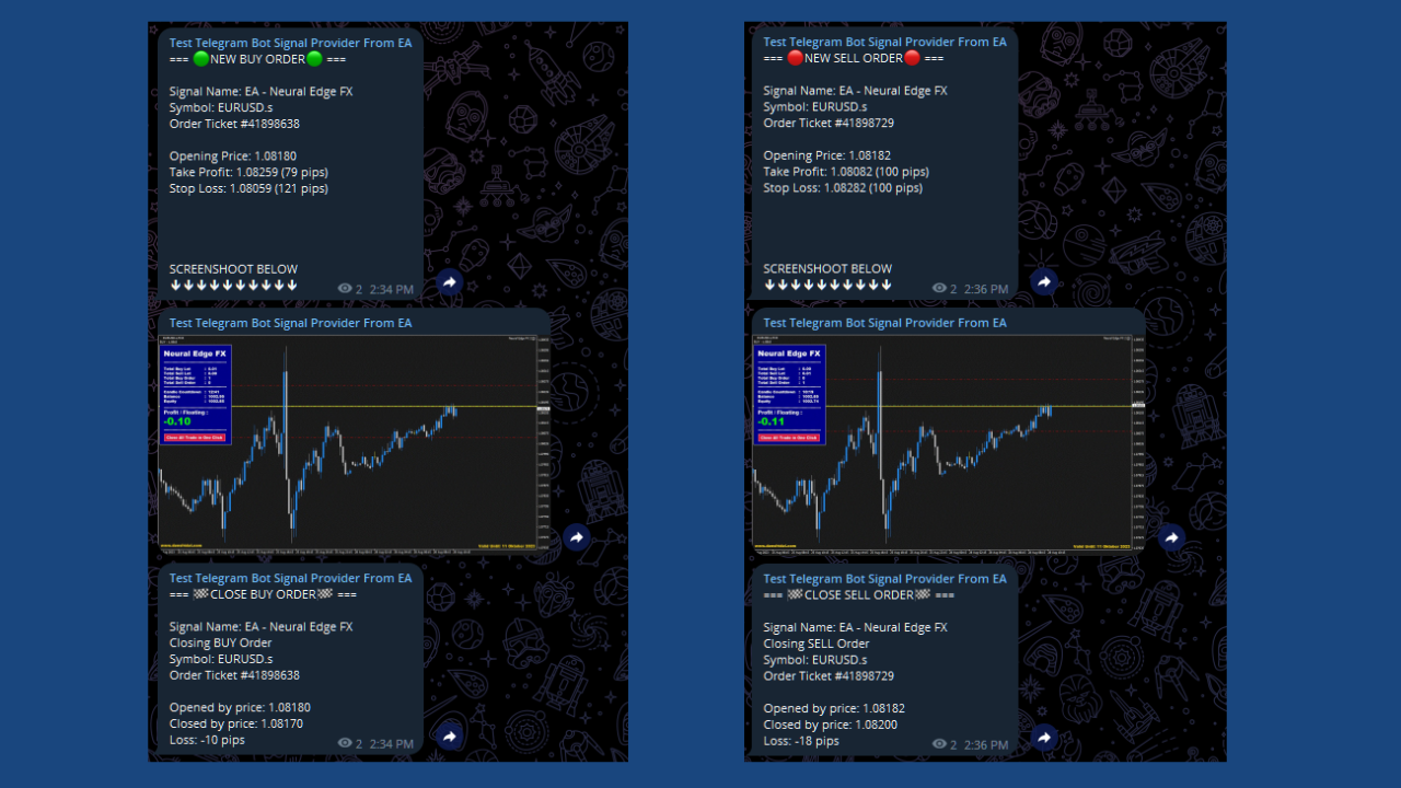 Telegram Trade Alert with Screenshot(スクリーンショット付きテレグラム・トレード・アラート)を使用 すると、EAの自動分析と、このインジケーターが提供するリアルタイムのコミュニケーション機能および視覚的なチャートインサイトを組み合わせることができます。スクリーンショットが含まれているため、Telegramグループやチャンネルのメンバーにより包括的で明確な市況の概要を提供することができ、EAの取引シグナルや分析を共有したい場合に非常に便利なツールです。