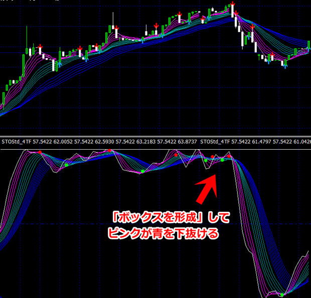 インジケーターの帯はピンク・緑・青の3層構造で、3層の帯は、収斂と拡散を繰り返しますので、 上昇時は、上から ピンク・緑・青 の並びとなり、下落時は、その逆で、上から青・緑・ピンクの並びになります。