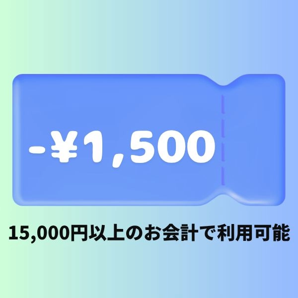 クーポン対象商品の合計金額が15,000円以上でご利用可能です。