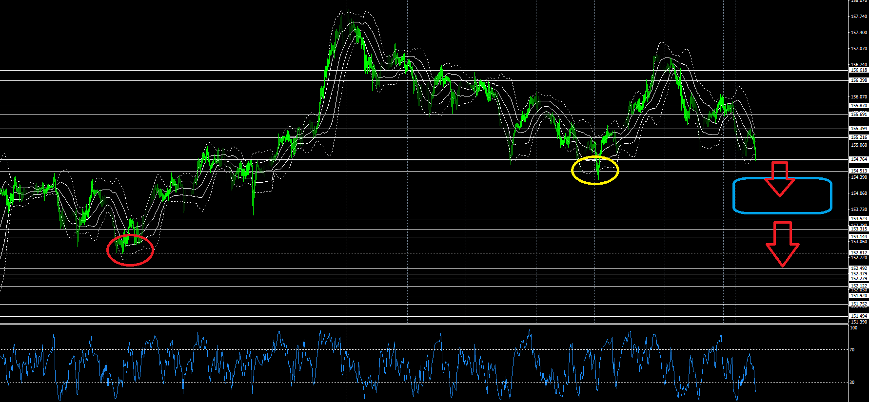 下げ目線でチャートを見た場合、黄色〇を↓ブレイクし15400到達。