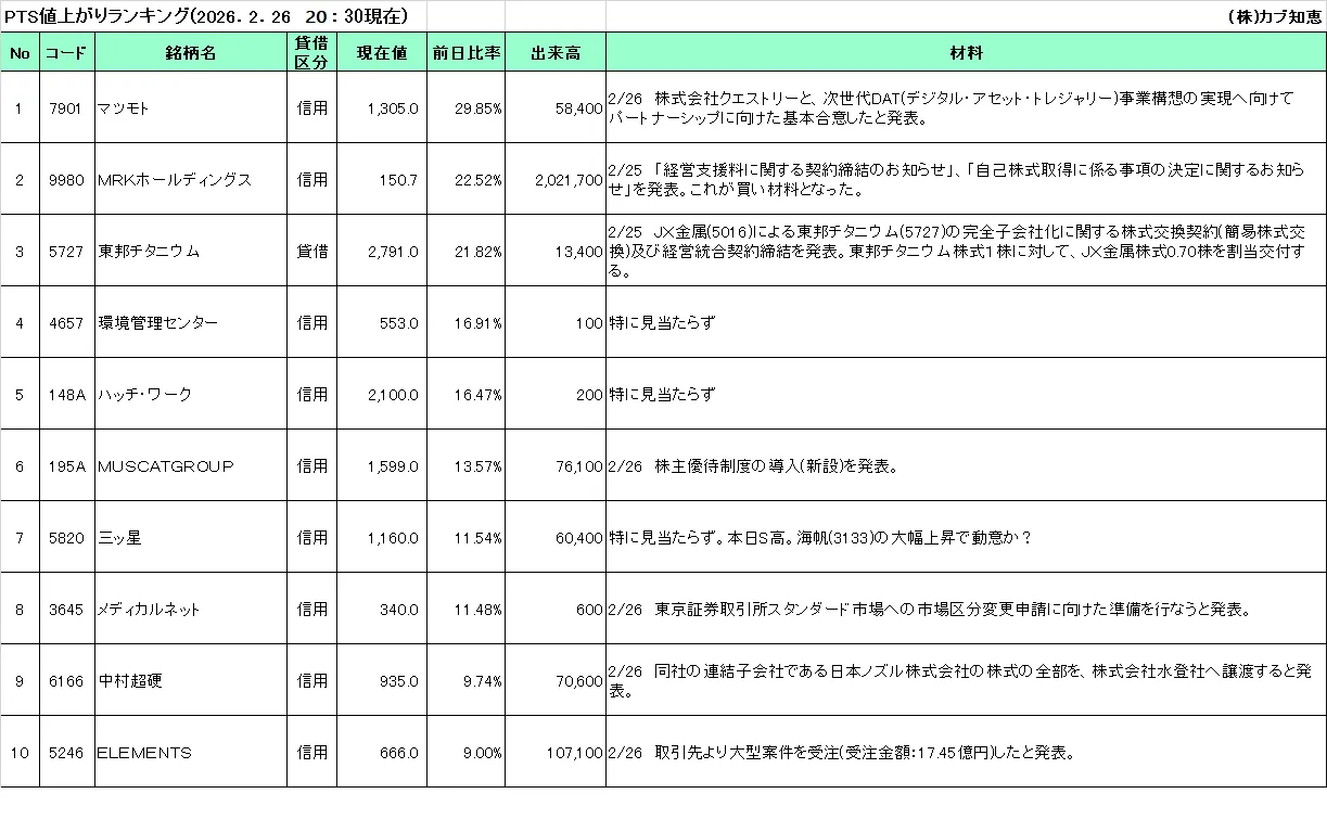 Kabu Chie Hatsu PTS rise TOP 10 (2026/02/26)