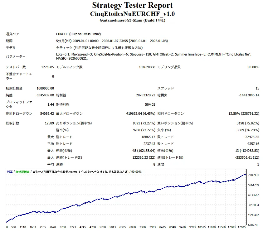 This EA is not a magic tool that makes assets multiply by simply leaving it alone. However, for those who deeply understand EUR/CHF characteristics and want to calmly turn the market’s “overheating and reversion” behavior into profits, this will be an exceedingly simple and honest companion.