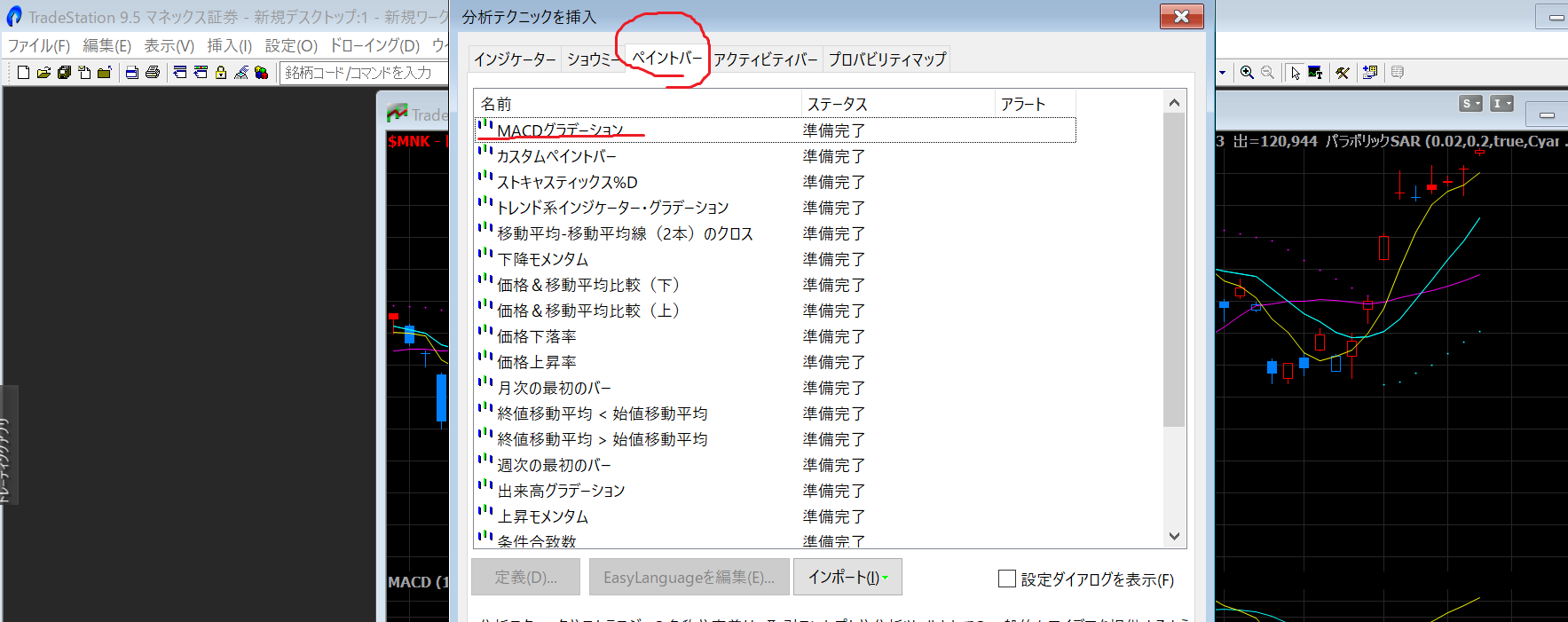 ⑦ペイントバーの中から【MACDグラデーション】をクリック