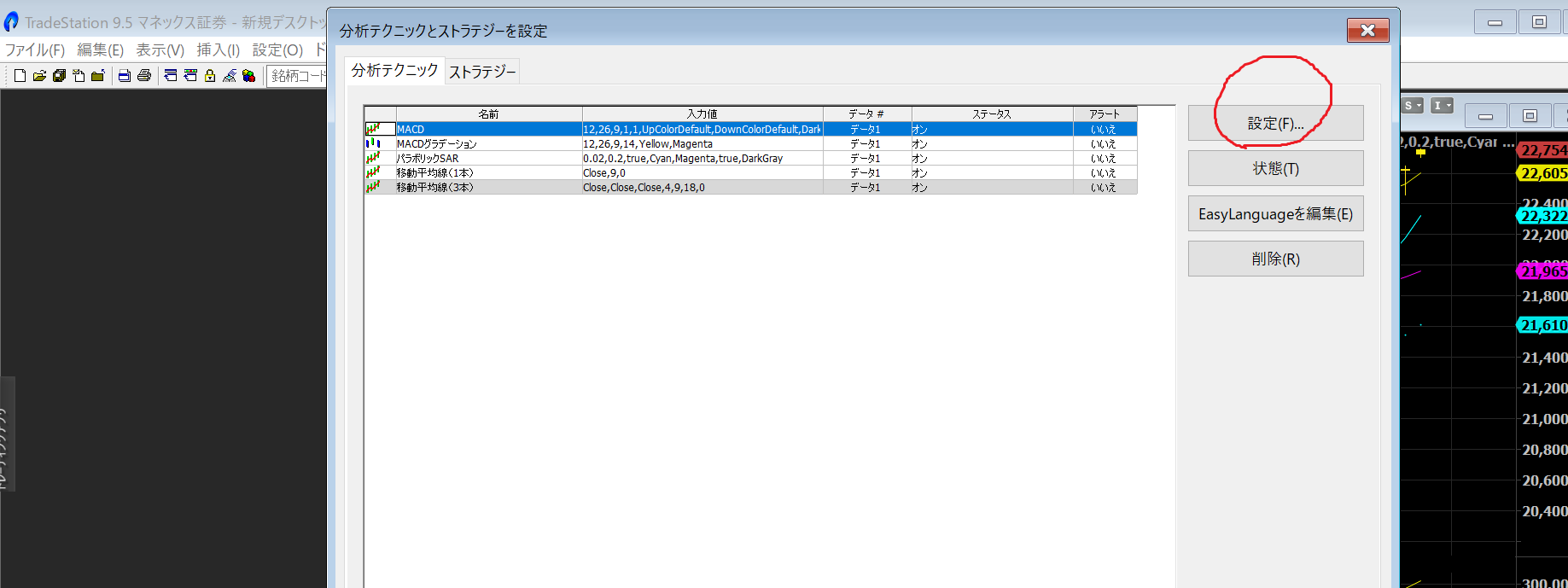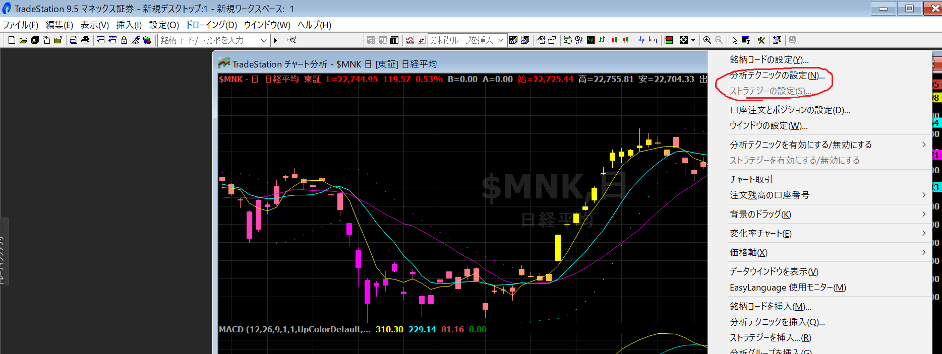 ⑧チャート上で右クリックして【分析テクニックの設定】をクリック