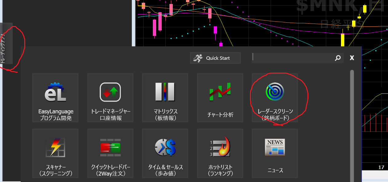 ⑪更にトレーディングアプリから【レーダースクリーン】をクリック