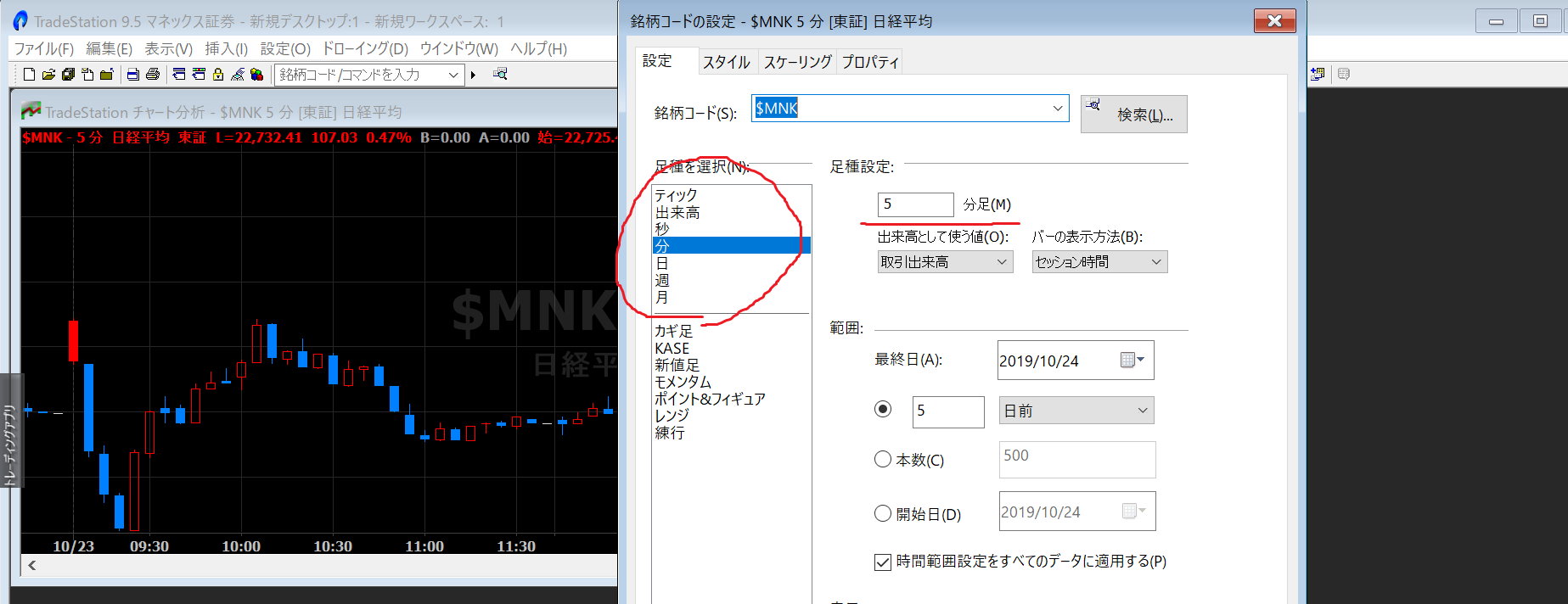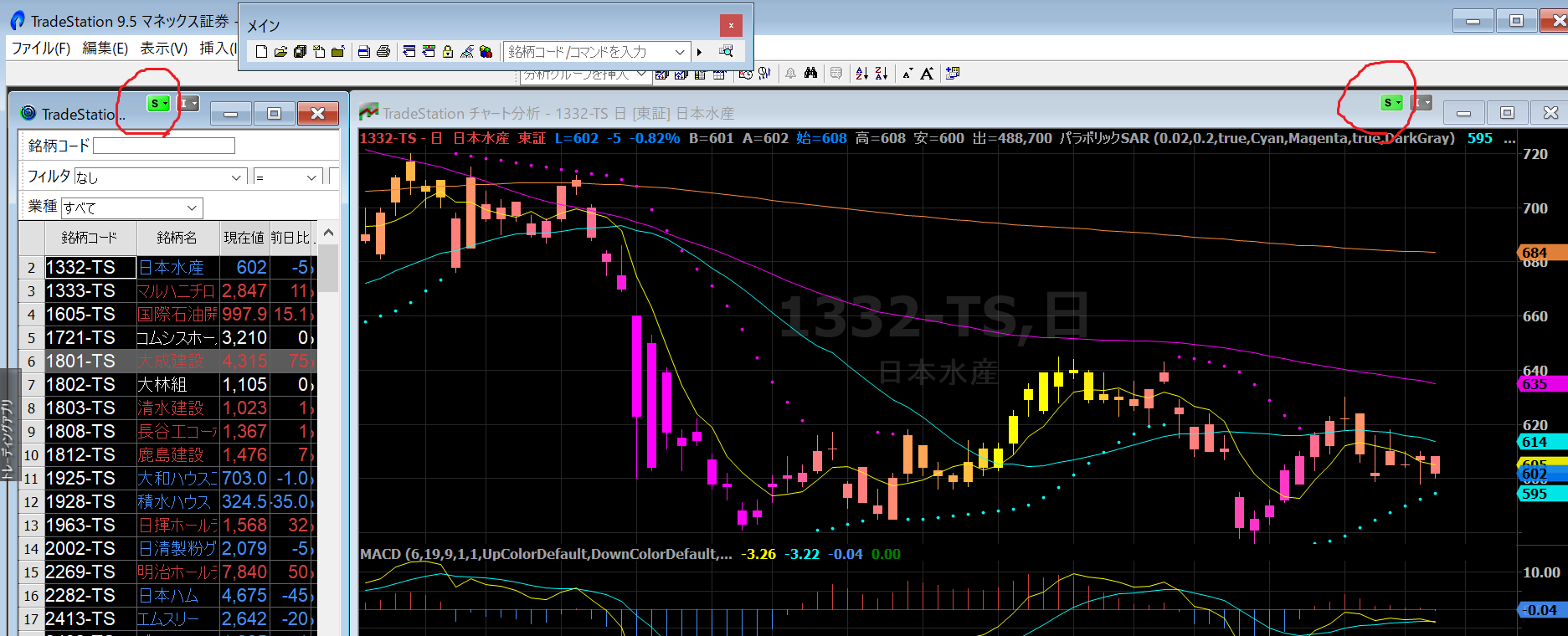 これで、チャートとレーダースクリーンがリンクしたので、レーダースクリーンの銘柄コードを選択してEnterキーを押すとその銘柄のチャートが見れるので便利です 。