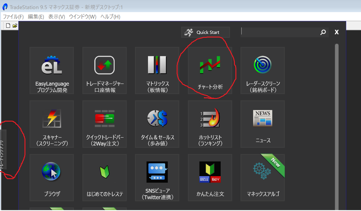 ②左端のトレーディングアプリをクリックして、アプリ内の【チャート分析】をクリック