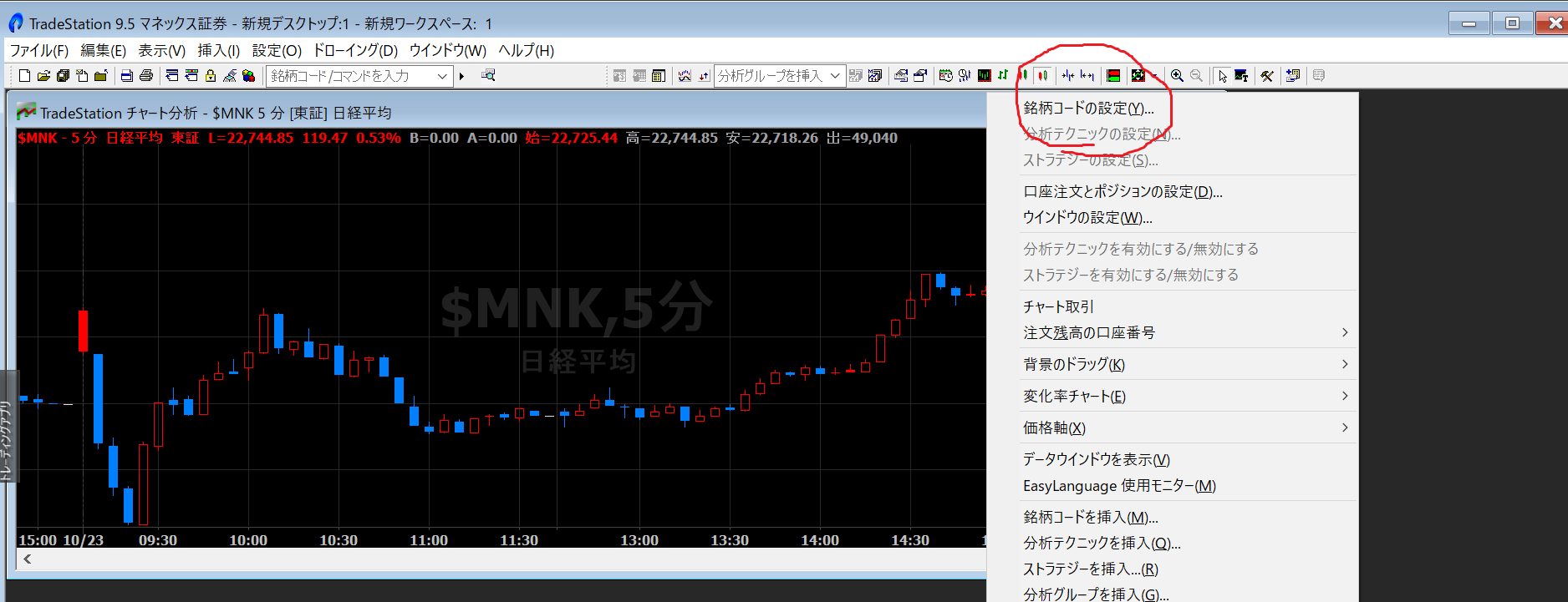 ③チャートの画面上で右クリックをして、【銘柄コードの設定】をクリック