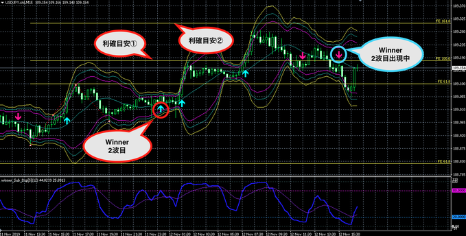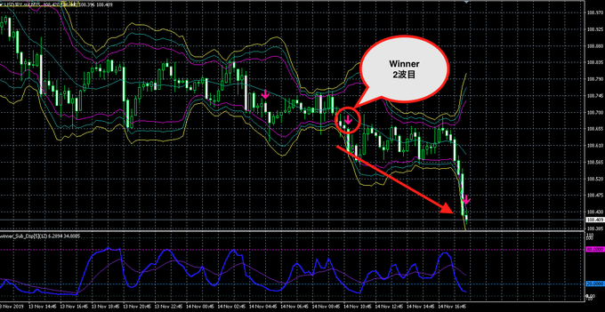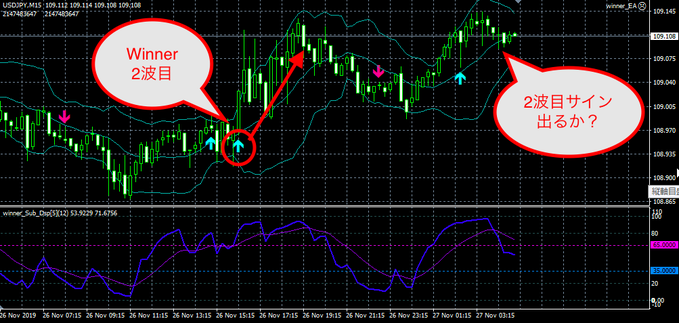 まずサブウィンドウのWinner値が35を下回ることで1波目が表示されます。