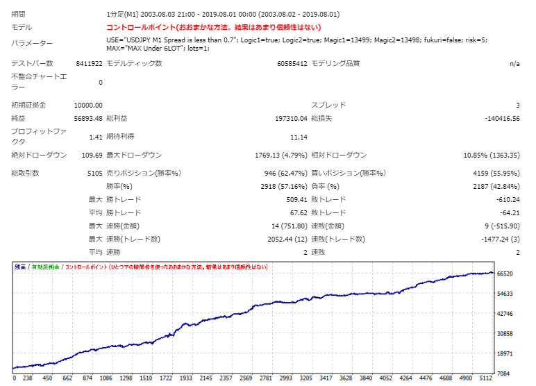 ▲2003年8月3日から2019年8月1日までの約16年間のバックテスト結果です。右肩上がりのきれいな収支曲線を描いています。