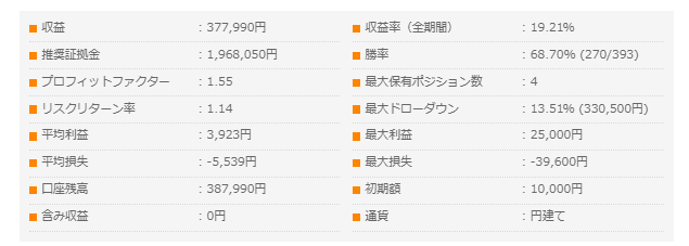 ▲トレード頻度が高めながらも、プロフィットファクター(PF)は1.5以上と優秀。稼働中はきちんと収益を積み上げていきます。また、勝率や収益に安定感があり、自身の資金額に合わせた運用を細かに調節できそうです。