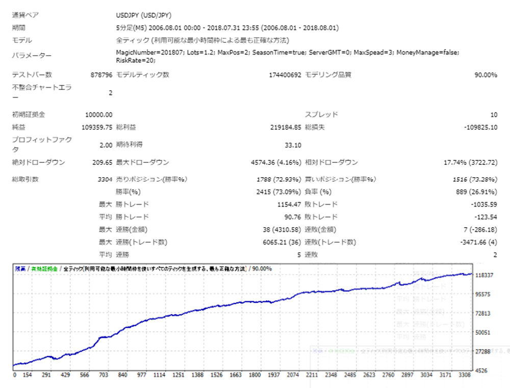 2006年8月1日から2018年7月31日までの約12年間のバックテスト結果です。しっかり10年以上テストされていて、取引回数も充分な3300回以上と申し分なし。優位性があることは一目瞭然です。