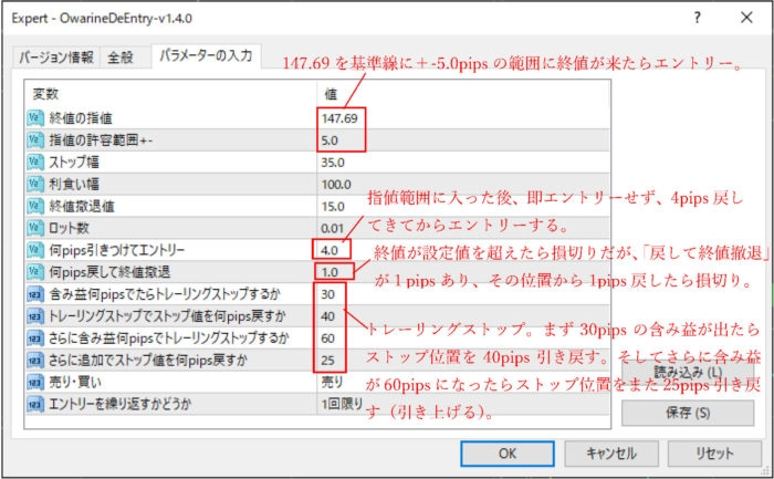You can enter when the close price hits a plus/minus ○ pips from the limit priceand, after the close price enters the limit range, you can choose not to enter immediately and instead enter when it retraces by “pulling in” by ○ pipsor enter at the retracement.Entering on a retrace rather than chasing after is more advantageous for trading. Even a few pips should not be underestimated.