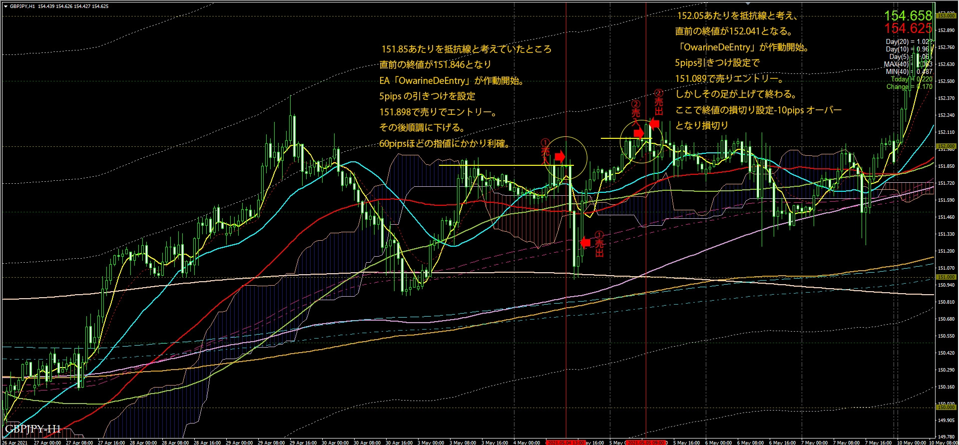 Consider a resistance line that seems likely to form the Donpisha Pattern, and place a limit order at that value using “OwarineDeEntry.”