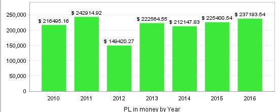 2017年がマイナスになっているのは、バックテストの強制終了により保有ポジションが強制決済されたためですが、2014年度にも一度マイナスになっています。