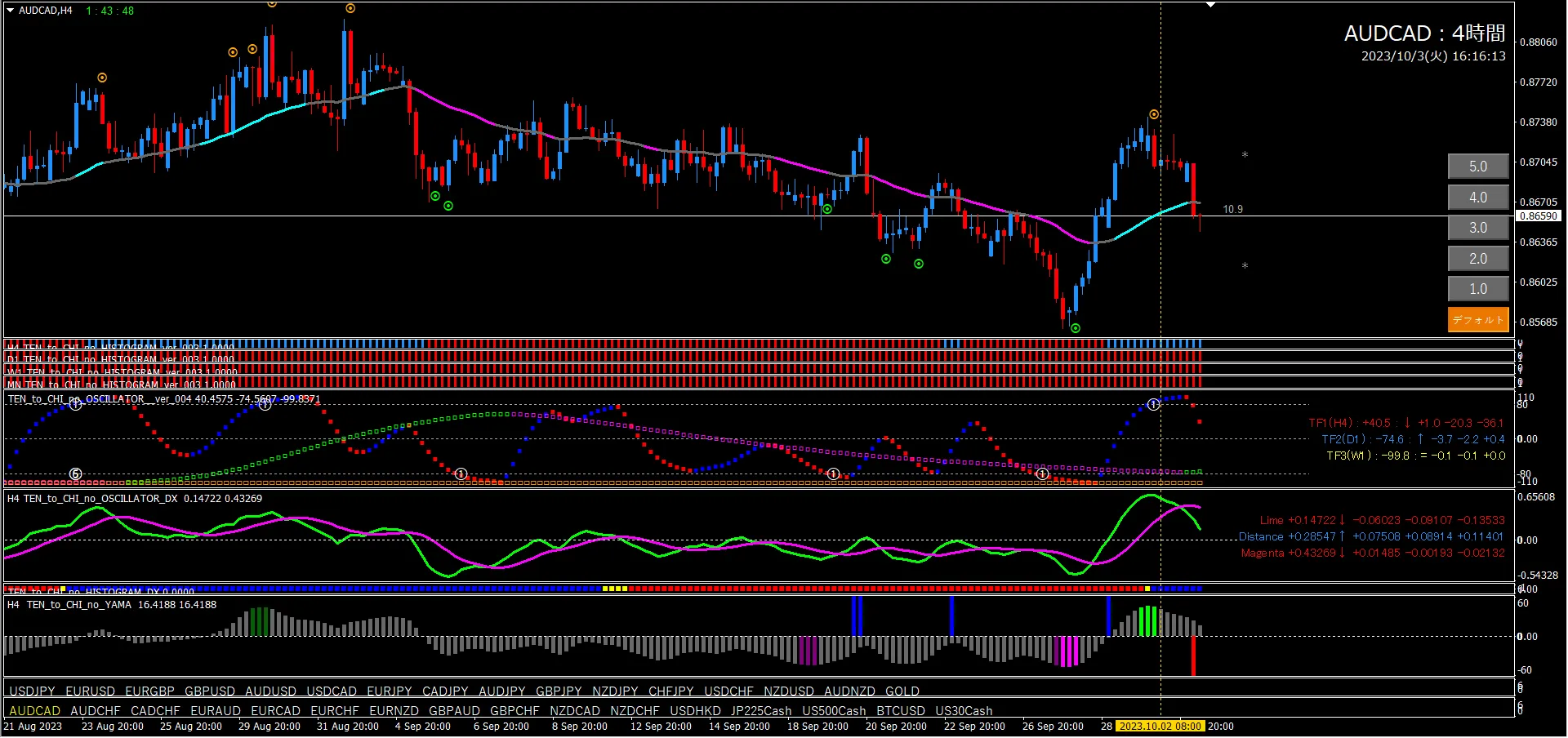 When Oscillator TF2 starts to fall from +80, set EA Pattern 1, and it will automatically enter short at the yellow dot and automatically take profit at the long signal. For details of Heaven and Earth EA, please refer to this article.