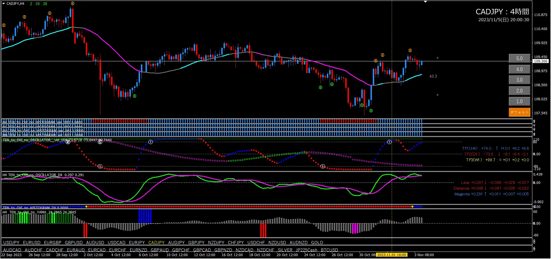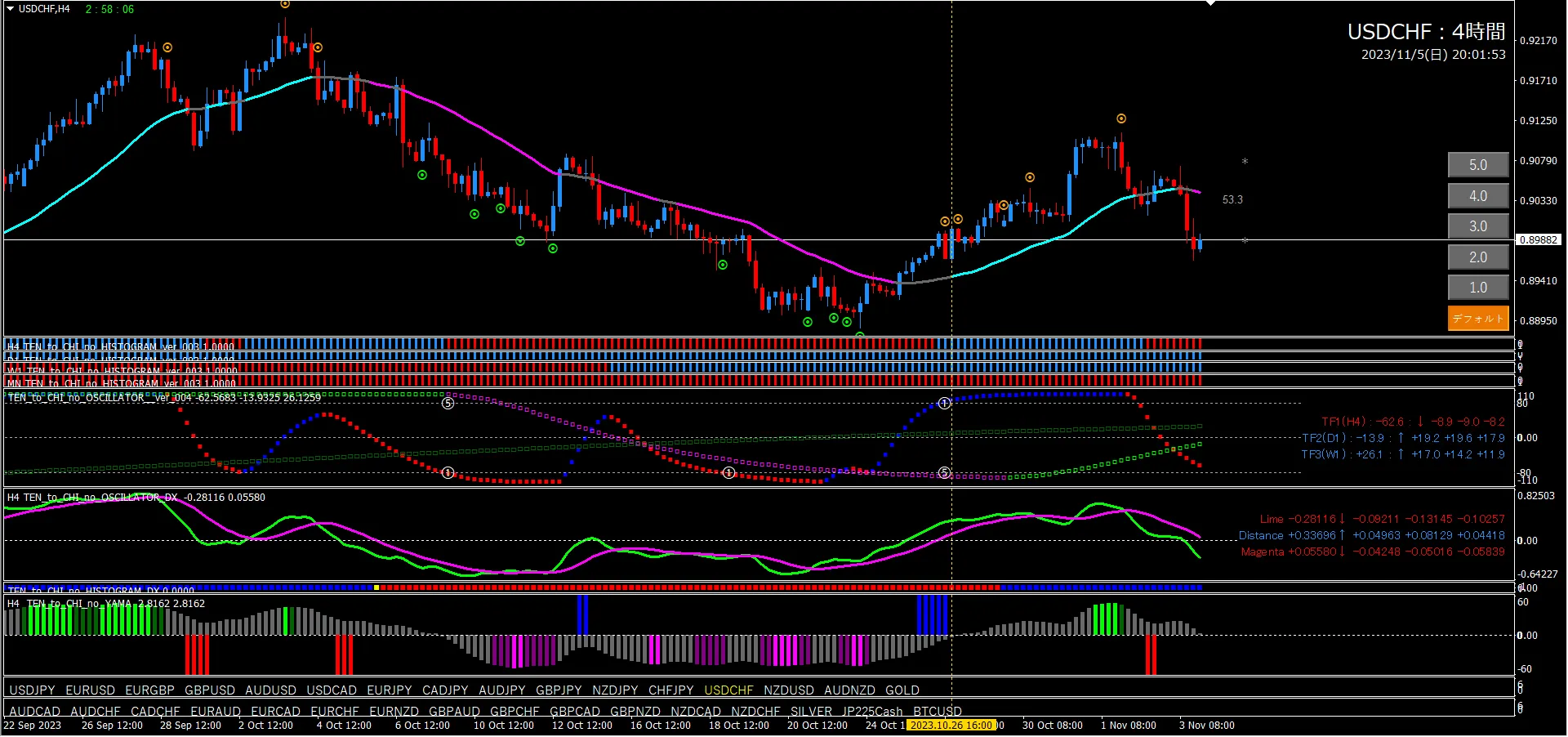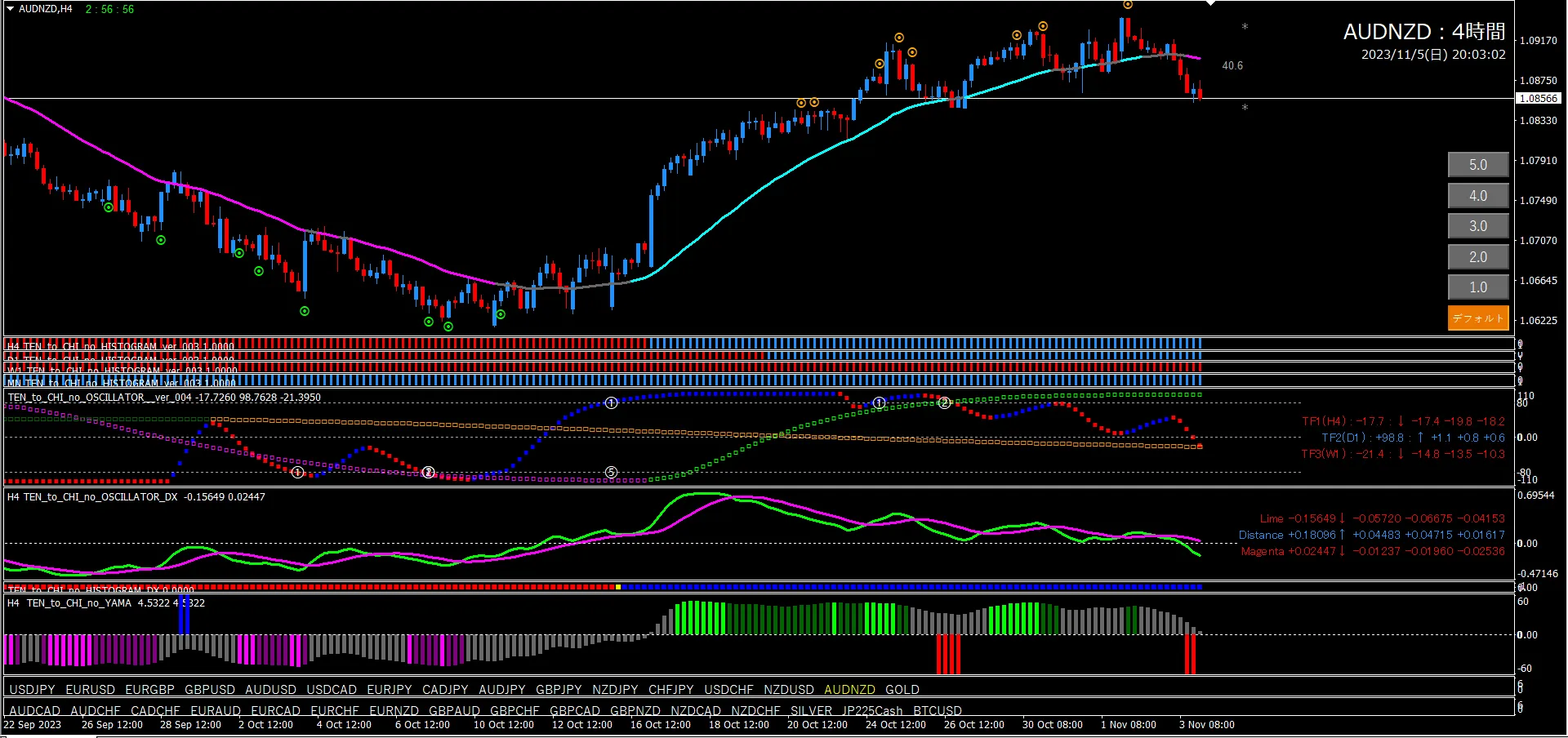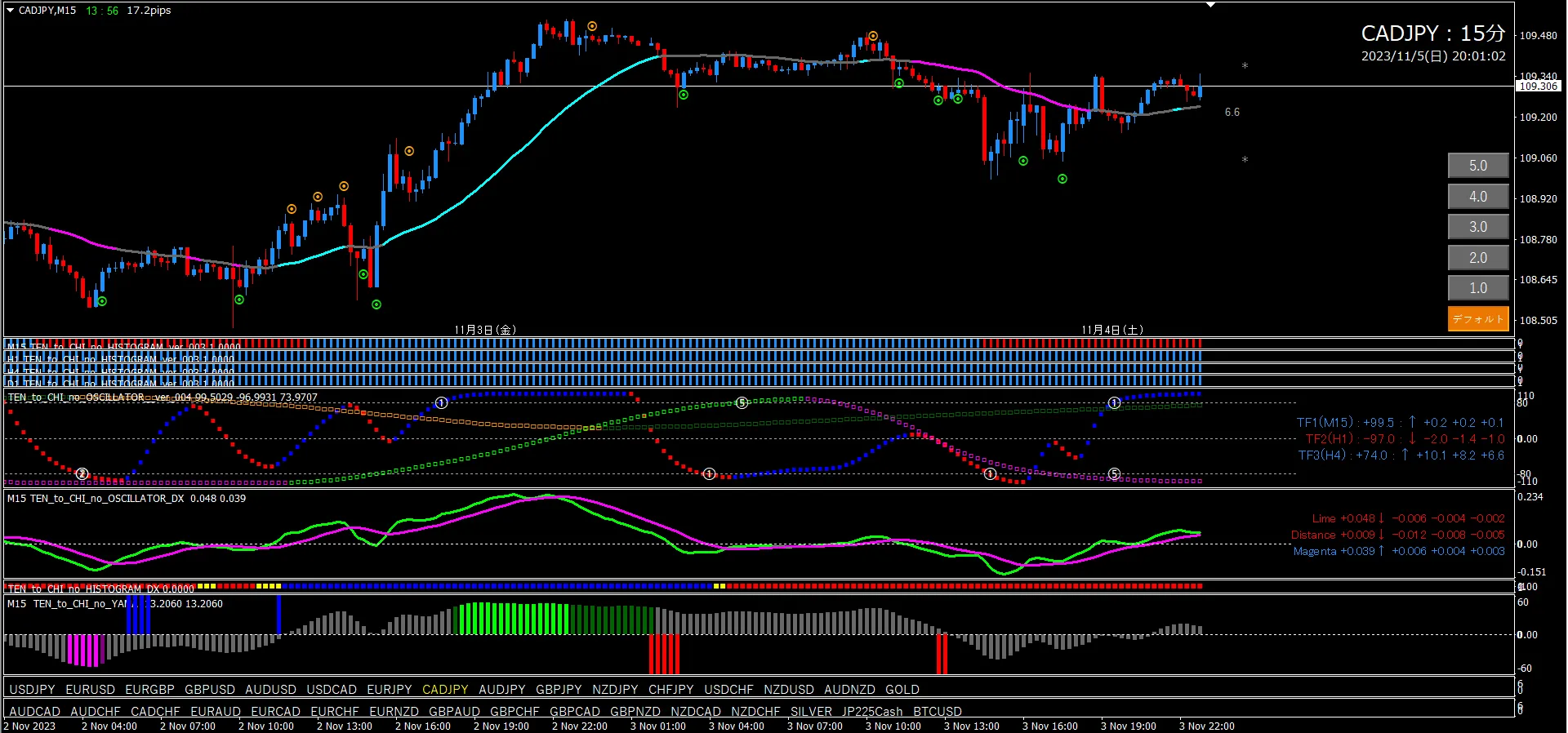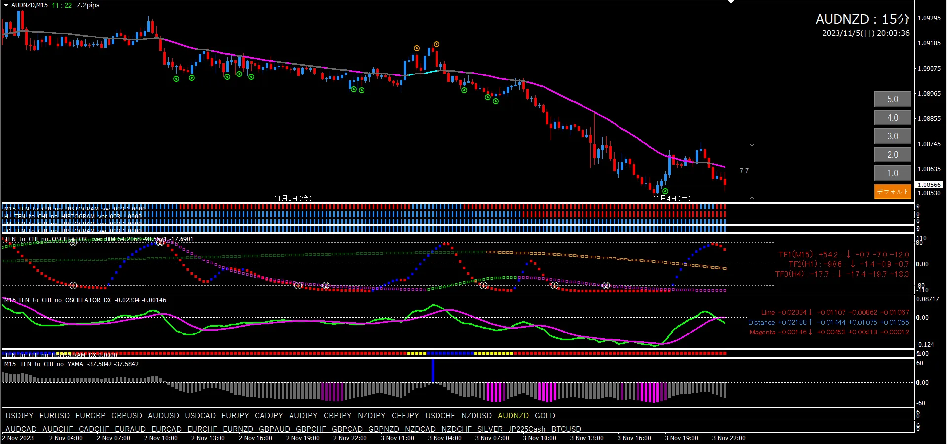 Oscillator TF2 is locked in, TF1 is rising from around +80. This is a basic pullback-buy pattern. The histogram is All blue. Oscillator DX already crossing upward. At this point an uptrend can be considered. However the candlestick is already above the line, so a short signal could appear at any time. When a short signal appears, the uptrend will reset.