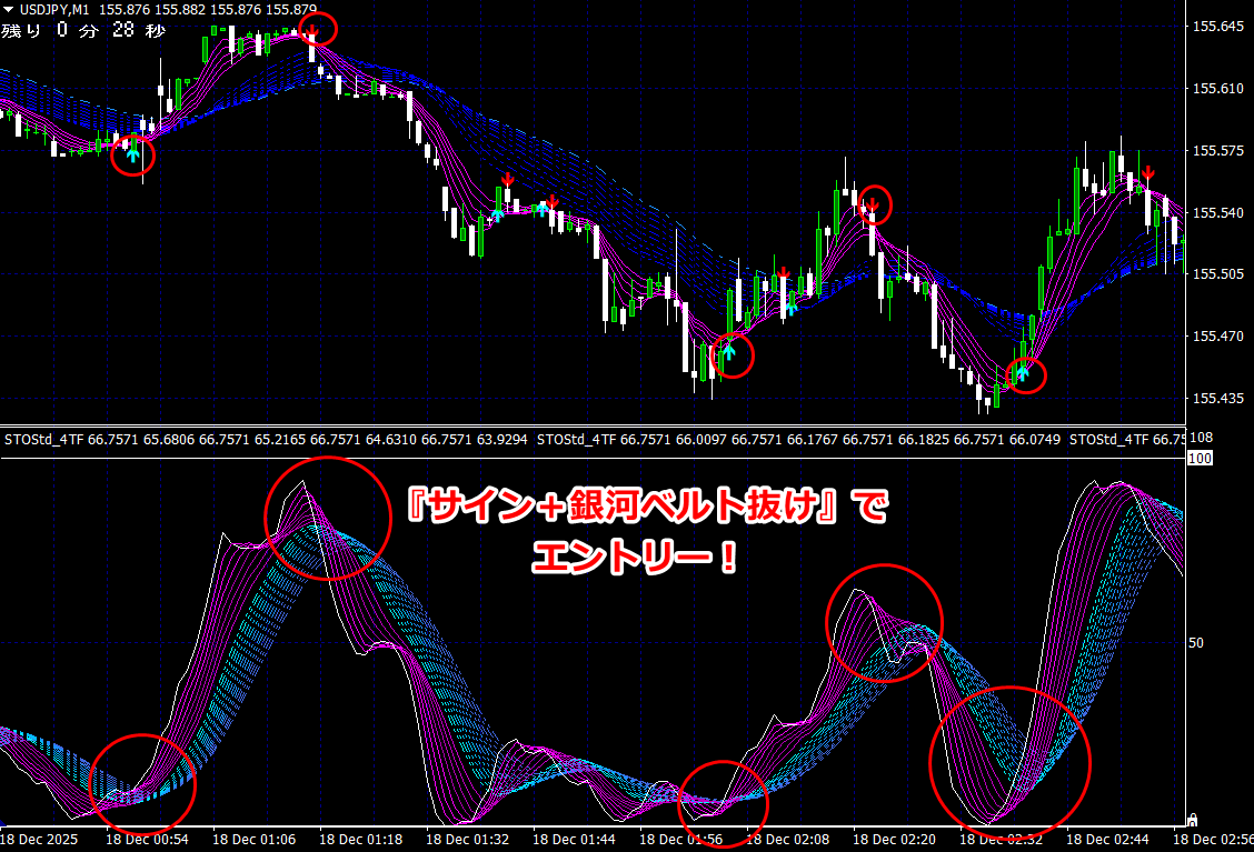 本日(12月18日)のGinkan(銀漢) (USDJPY 1分足) (画像クリックで拡大) FX・バイナリーオプション・日経225の全てに対応! シリーズ最高精度を誇る(取引履歴は、ページ末に掲載) 最新版メタトレーダー(MT4)用インジケーター Ginka...