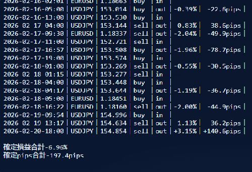 取引 2026-02-16-02:01|EURUSD|1.18663|buy |in | 2026-02-16-05:00|USDJPY|153.014|buy |out|-0.39%| -22.6p