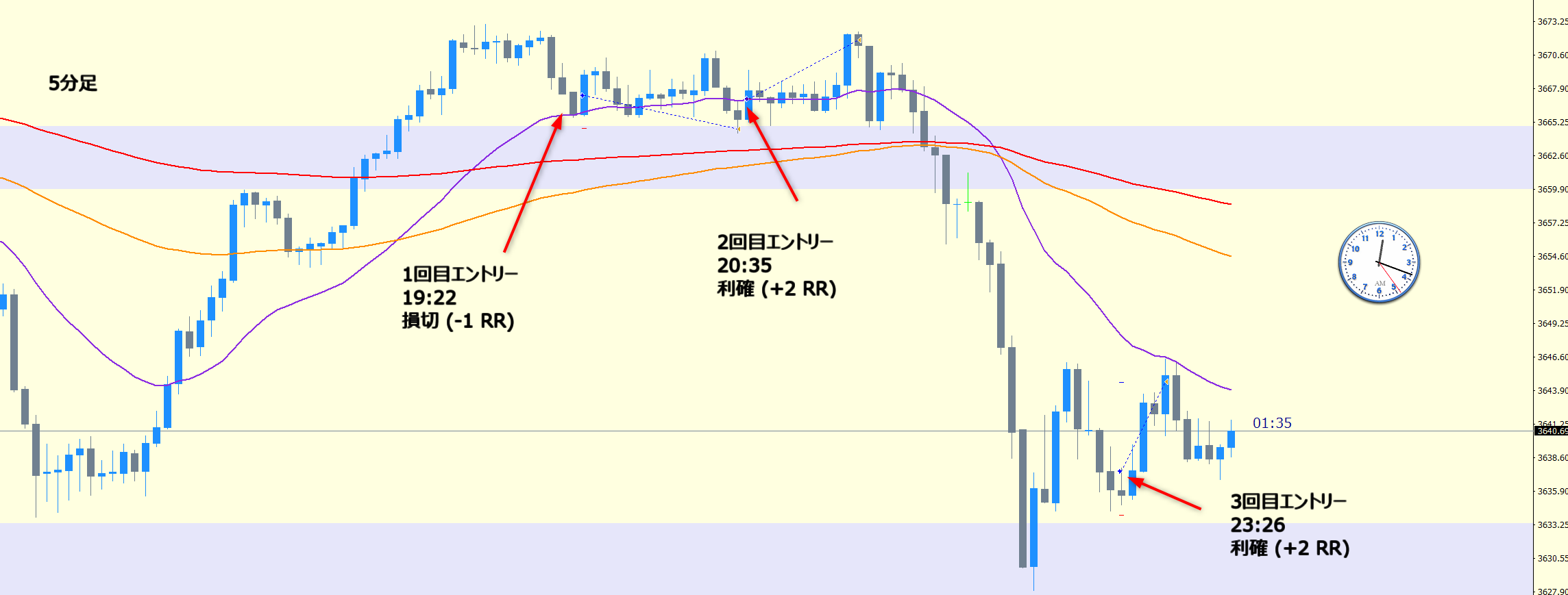 結果、損切になりましたが、すぐに次の一手で想定していたパターンが来ましたので、2回目のエントリーです。第一利益目標で+ 2 RRで利確しました。