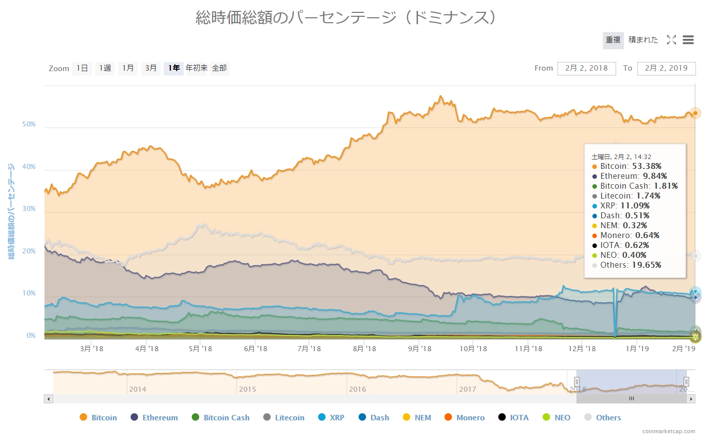画像は2019年2月2日のキャプチャ。昨日は下落の流れに回帰して、主要どころが1~4%の下落を見せていました。今日はその反動で調整的な戻りが発生し、全面的に「緑」となっています。リップルは2%超、ビットコインキャッシュは3%超の上昇です。