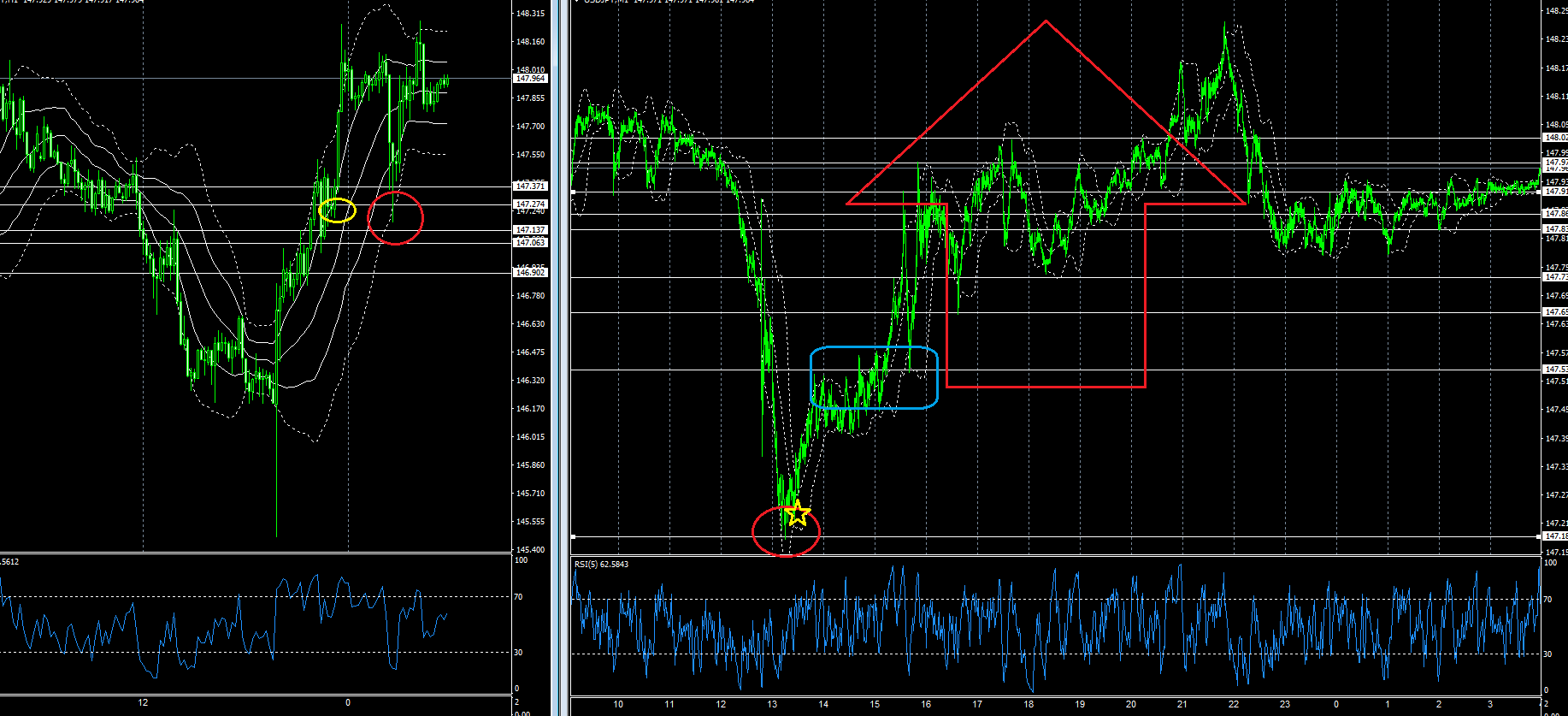 そう言ったうえで1分足を見ながら、今ならポジして失敗しても、損切は5Pで済むなとか、ある程度計算した上で参戦するというスタンスやクセを付けるべきです。