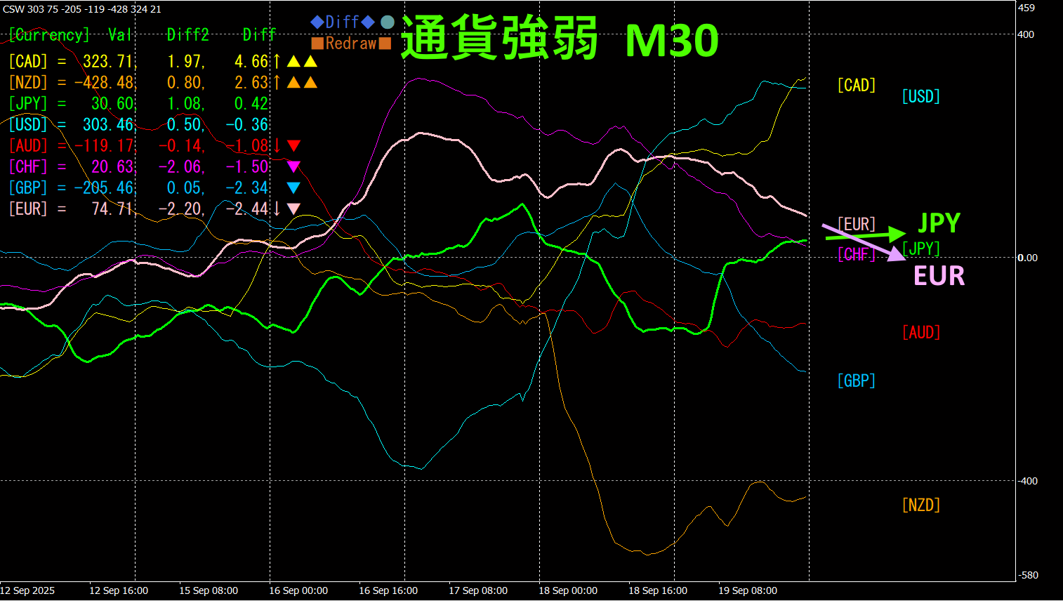 30分足の通貨強弱チャートです。