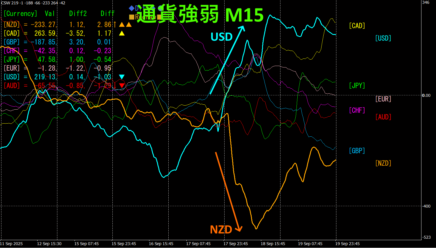 15分足の通貨強弱グラフを見ると、USDとNZDが、見事な逆相関関係になっていることがわかります。USDとNZDが収束から拡散に向かう時に、USD>NZDなので、NZDUSDの売りで利益が得られます。通貨強弱グラフを参照すれば、木曜日の売り時を、容易に見つけることができます。