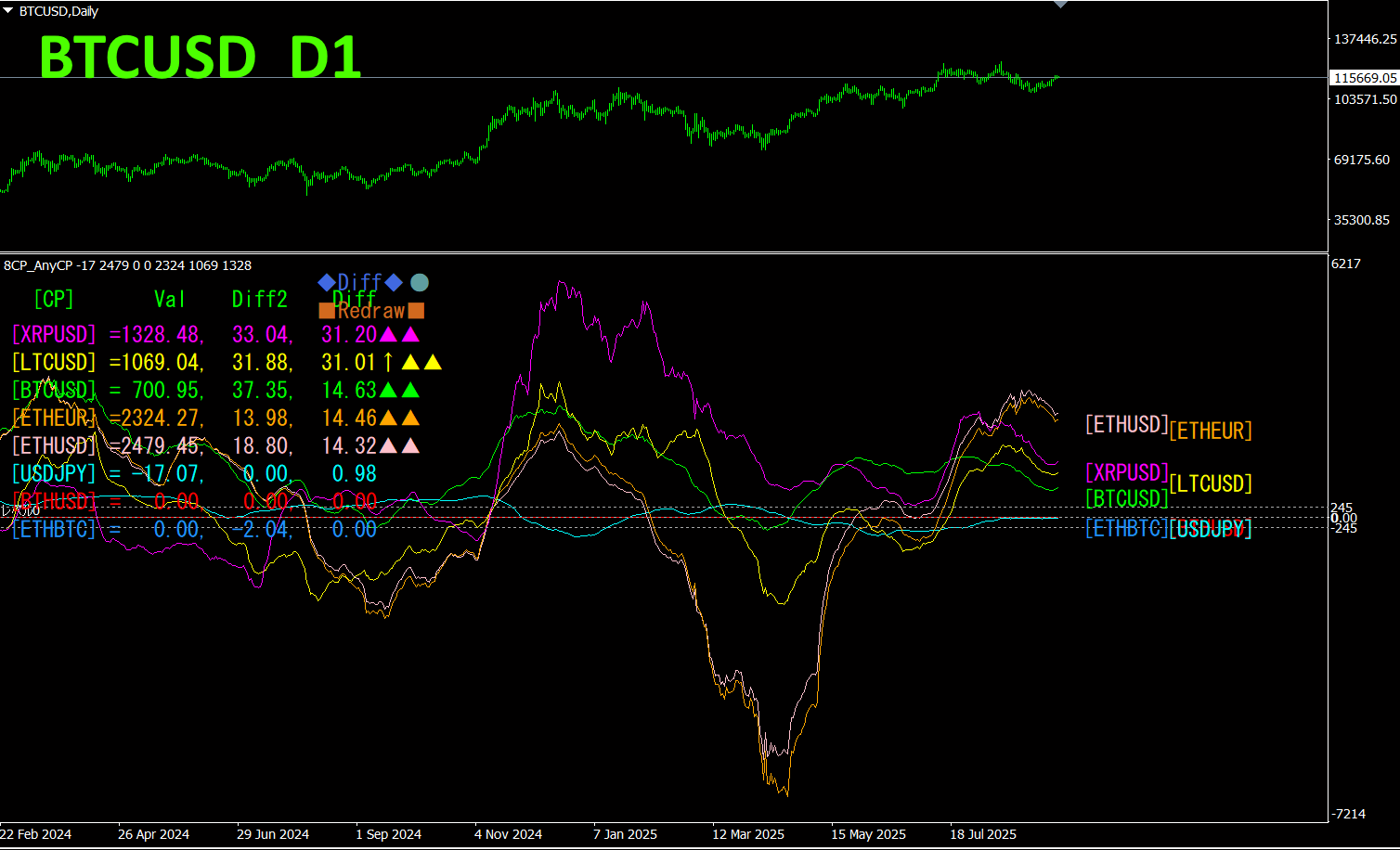 「8CFD見える化インジケータAny版」は、名前にAnyがある通り、どのようなSymbolにも対応できます。任意のSymbolを設定できるので、仮想通貨とUSDJPYを設定して、それらを比較してみました。チャートは日足です。