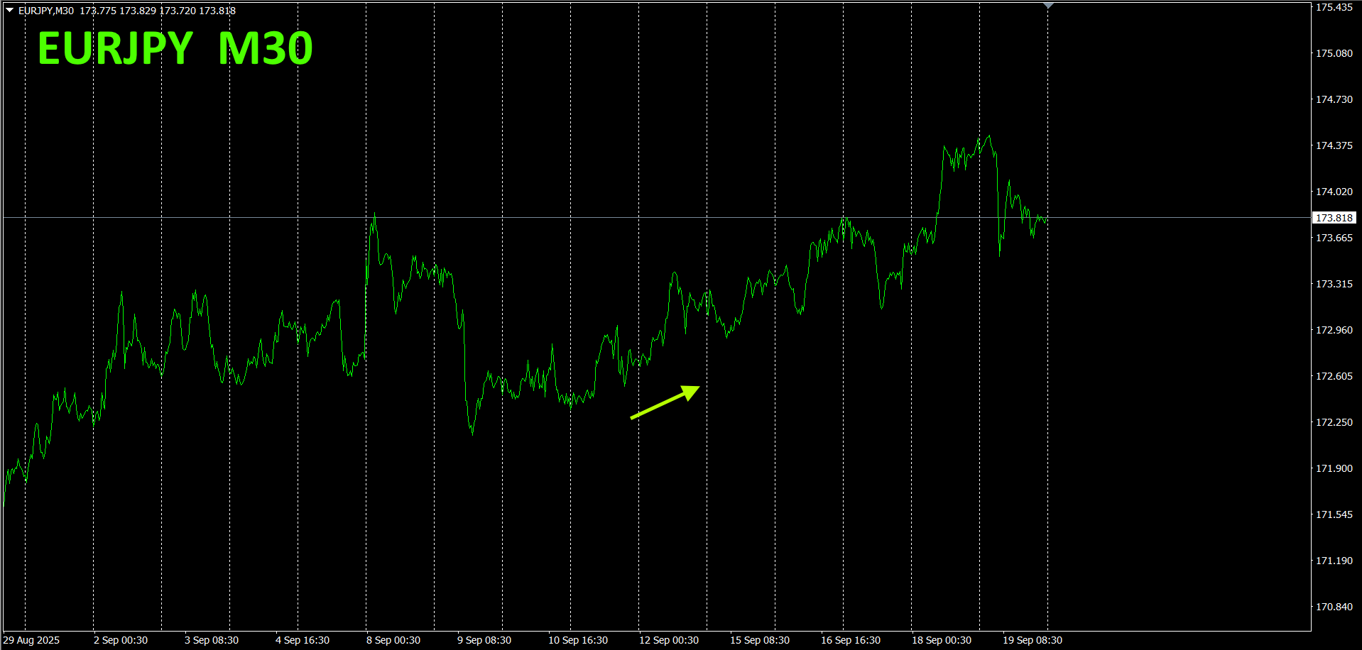 ピンク色がEUR、緑色がJPYです。EURもJPYも、やや上向きになっています。EURJPYにはっきりした方向感は出ていません。傾きから考えてEURJPYは、やや上昇気味に推移すると考えられます。