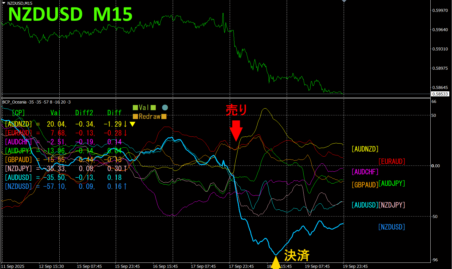 上半分は、NZDUSDの15分足チャートです。下半分は、「8CP見える化インジケータ」によるものです、水色太線のグラフがNZDUSDに相当します