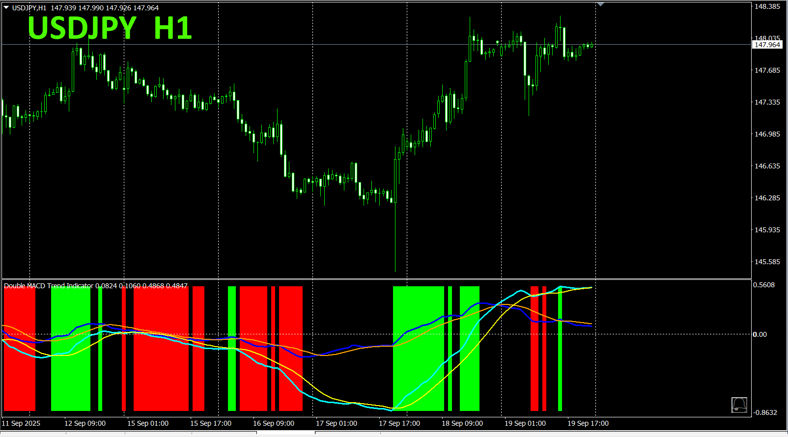 「Dual_MACD_Trend_Indicator」で、緑色のゾーンなら買い、赤色のゾーンなら売り、それ以外ではトレードしないという単純なルールに従うだけです。