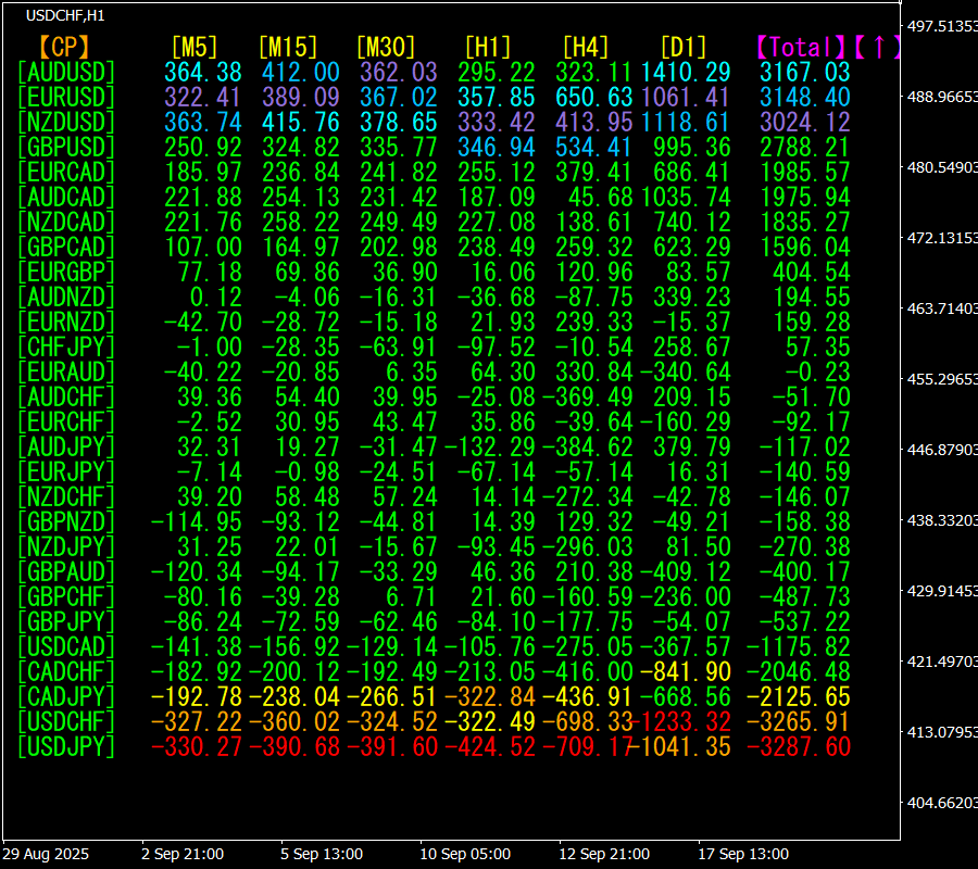 [Total]数値の降順に並んでいます。一番下にあるUSDJPYは、全ての時間足で赤色系の表示色になっています。Total数値が -3287.60と、大きなマイナスの数字になっています。USDJPYに大きな下降トレンドが発生していることが示唆されます。
