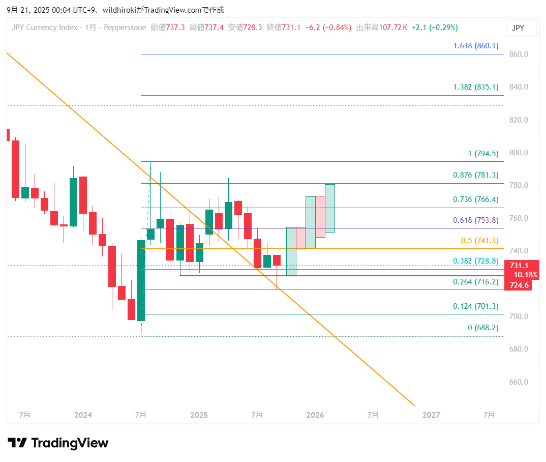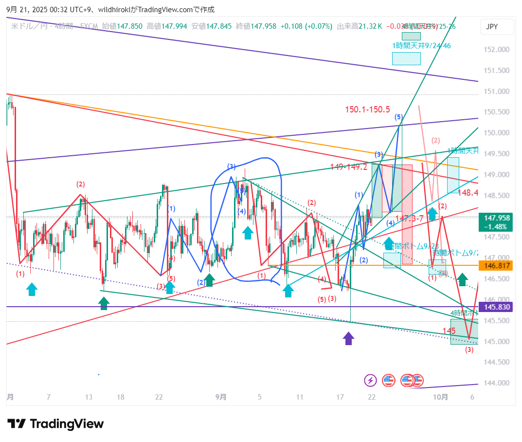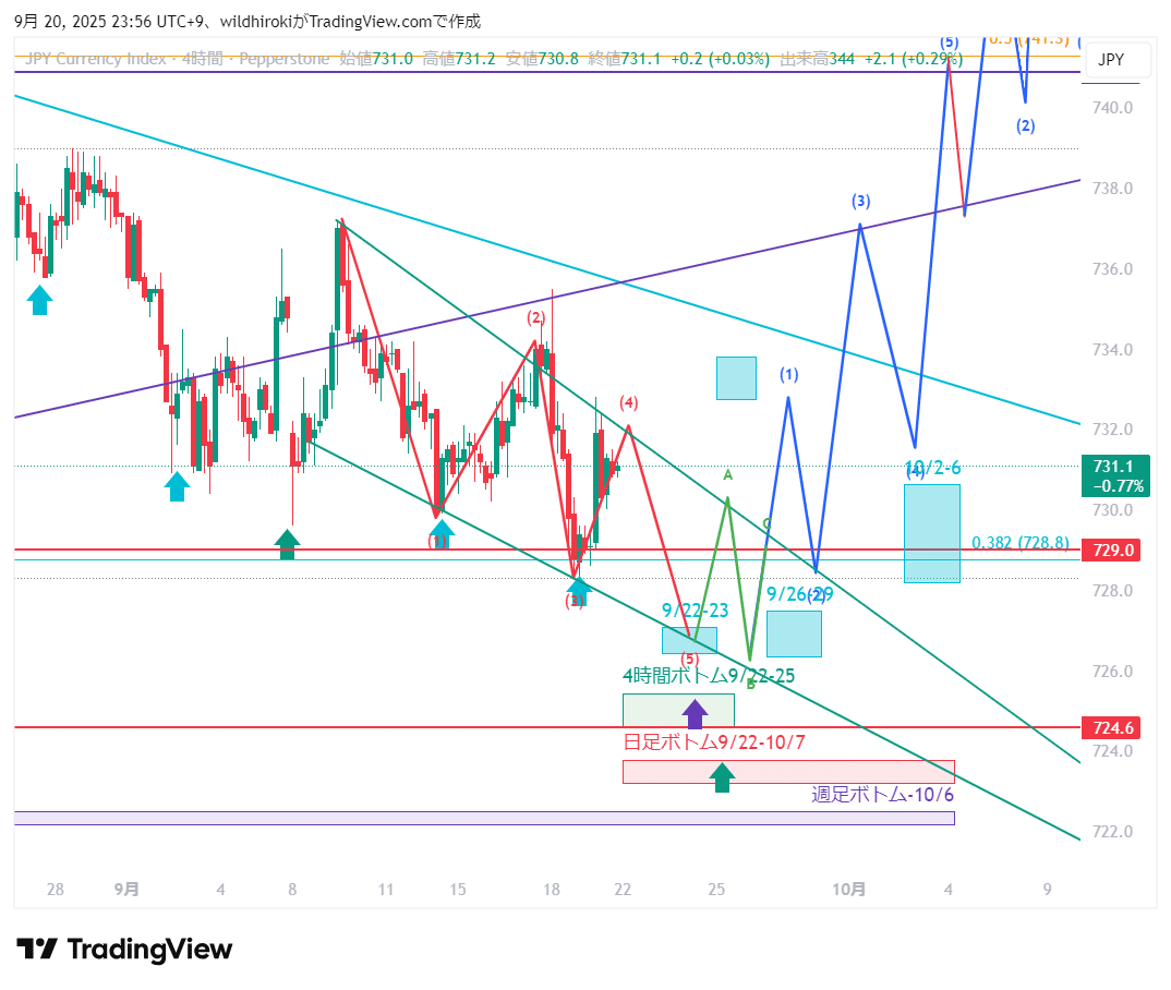 1時間サイクルから想定するに、9/22か23が日足週足ボトムだと思うんですが、JPYはボトム付けてから一旦下落してから上昇する傾向にあります。