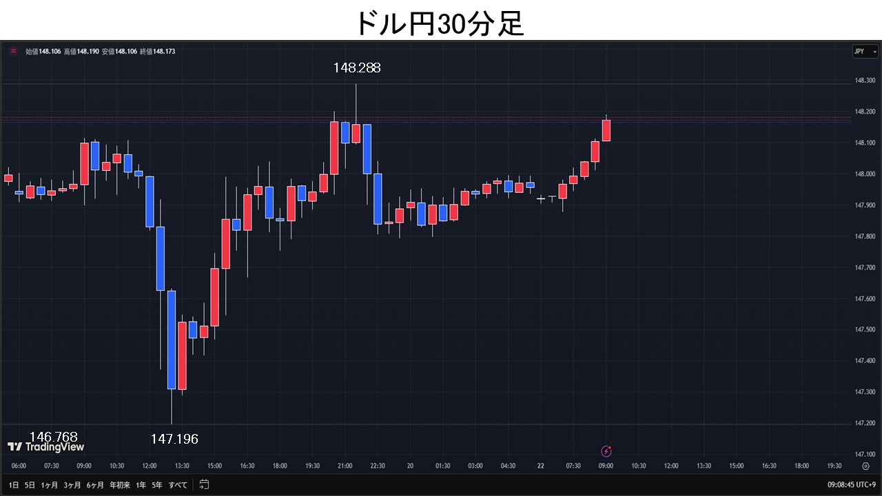 東京時間、日銀が予想通り政策金利を0.50%で据え置くことを決定したが、2名の審議委員(高田委員・田村委員)が0.75%への利上げを主張したことが伝わると急落。また、上場投資信託(ETF)の売却を開始することを決定したことも売りを促し、一時147.19円まで下落。しかし、売り一巡後はショートカバーが入り147.80円台まで回復。欧州時間、植田和男日銀総裁は金融政策決定会合後の記者会見で「今後の金融政策、もう少しデータを見たい」「経済の下振れリスクは、そこそこある」などと述べ、追加利上げの時期については言及しなかった。ドル円は147円台後半で小動き。NY時間、米10年債利回りの上昇を受け148.28円まで上昇。その後は、週末のポジション調整による売りなどもあり、147円台後半で小動きとなった。