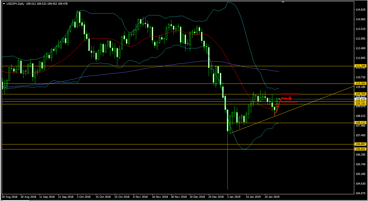 ドル円の日足チャートから見てみます。ドル円日足では、以前から強めと思われていた109.337円のラインを一旦下抜けしたのですが先日また109.337円と109.765円のサポートレジスタンスラインの間に引き戻された形となってしまいました。またしばらくはこのドル円109.337円のサポートラインと109.765円のレジスタンスラインの間を推移するものと予想されます。
